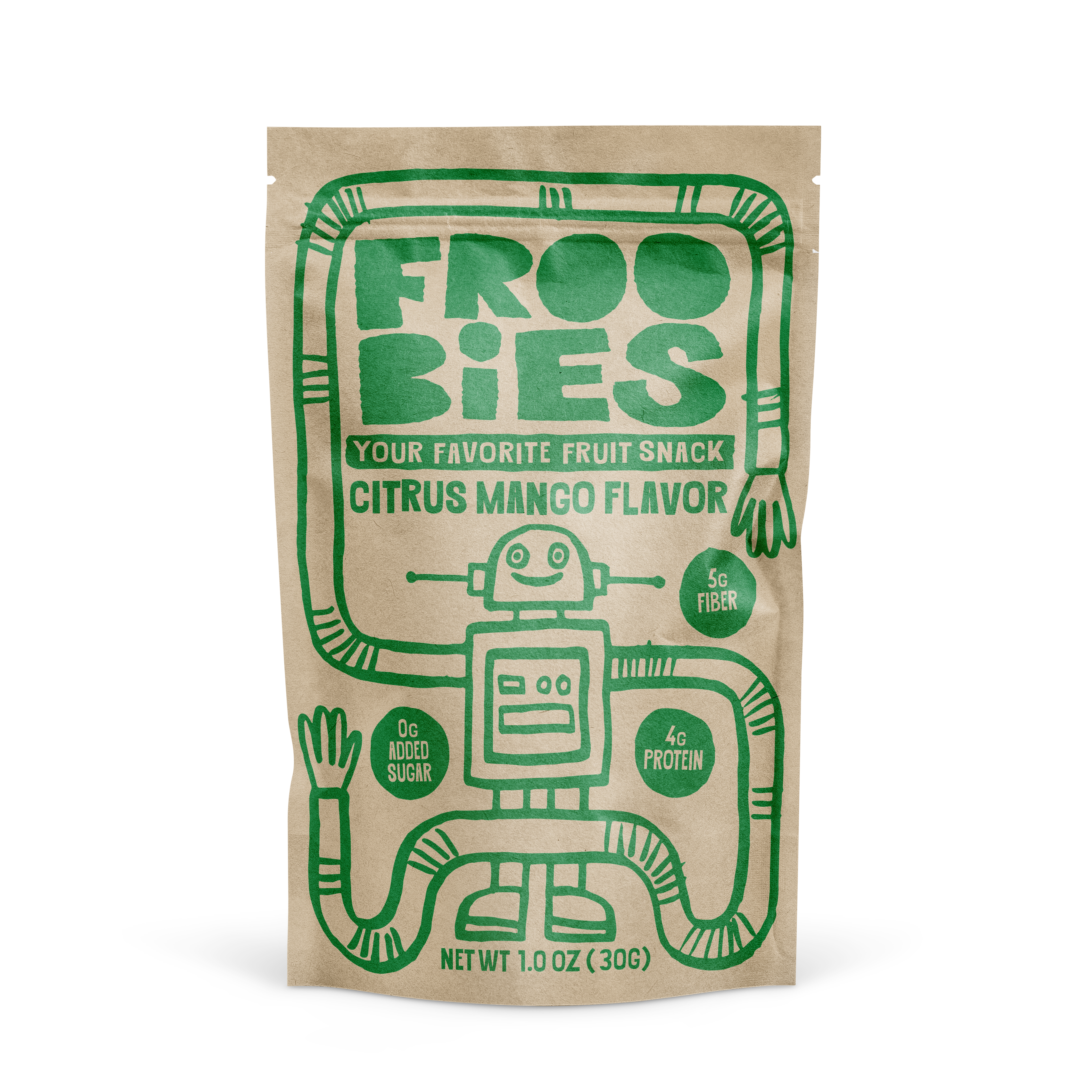 • Froobies Citrus Mango fruit snacks pouch featuring a green robot illustration. Packaging highlights 4g protein, 5g fiber, and 0g added sugar.