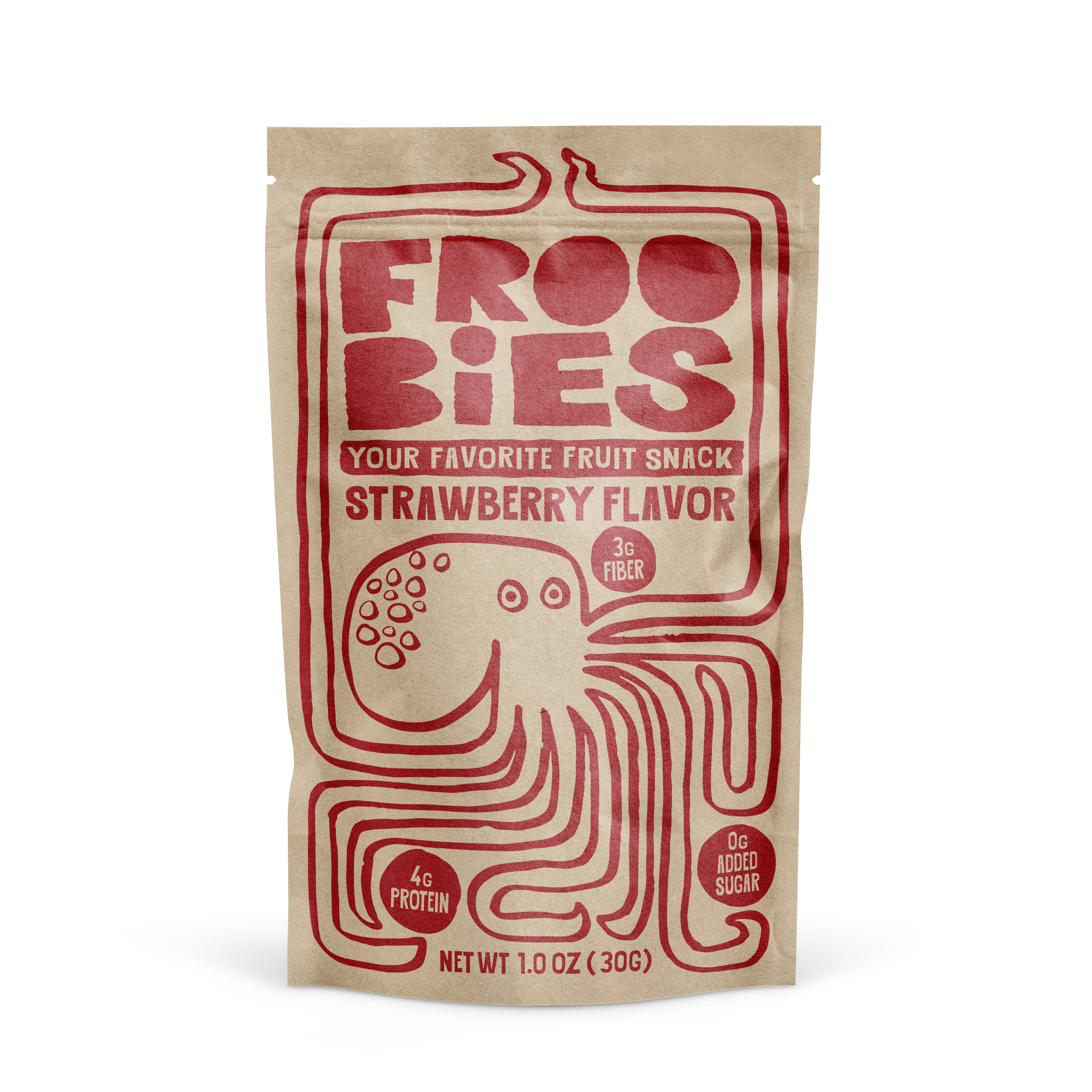 • Froobies Strawberry fruit snacks pouch featuring a red octopus illustration. Packaging highlights 4g protein, 3g fiber, and 0g added sugar.